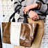 Created for the ultimate adventurer, the Get-Away Tote is the perfect size for work, travel, hauling goodies to sporting events----or just to Get Away from it all.  The Get-Away tote is sewn on our beautifully durable, double-finished leather, so that it is essentially mess proof + wipeable. Unlined.