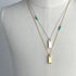 One of our first designs, our simple + elegant ribbon tag necklace is a perfect piece to wear on its own or layer with others.  Chain is accented with three turquoise beads---something that we have added to our signature pieces from the start.